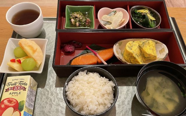 焼き魚や卵焼きに加えて副菜もいくつかあり、最後の食事まで豪華で満足感のある内容でした。