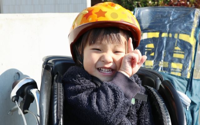 自転車に子どもを乗せる際には、ヘルメットをしっかり着用しましょう!